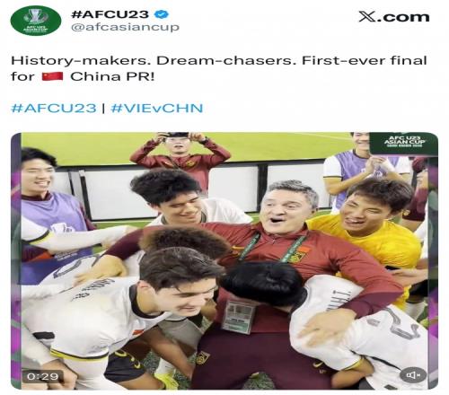 U23亚洲杯为视频配文写道:“历史的书写者、追梦人,这就是首进决赛的中国队!”